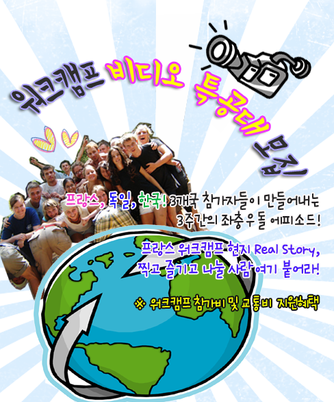 프랑스에서의 3주! 잊지 못할 추억을 생생한 영상으로 남길 대한민국 대표, 워크캠프 비디오 특공대! 관심 있는 많은 분들의 지원을 기다립니다.