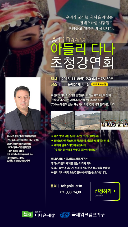 모집 유니세프 팔레스타인 '아들리 다나' 초청강연회 2013-11-01 작성자: 관리자 조회수: 817 < 이전 [모집] 워크캠프 토크콘서트_ 청춘, 전세계로 튀어! 다음 > [공지] 국제협력 담당 직원 채용 목록