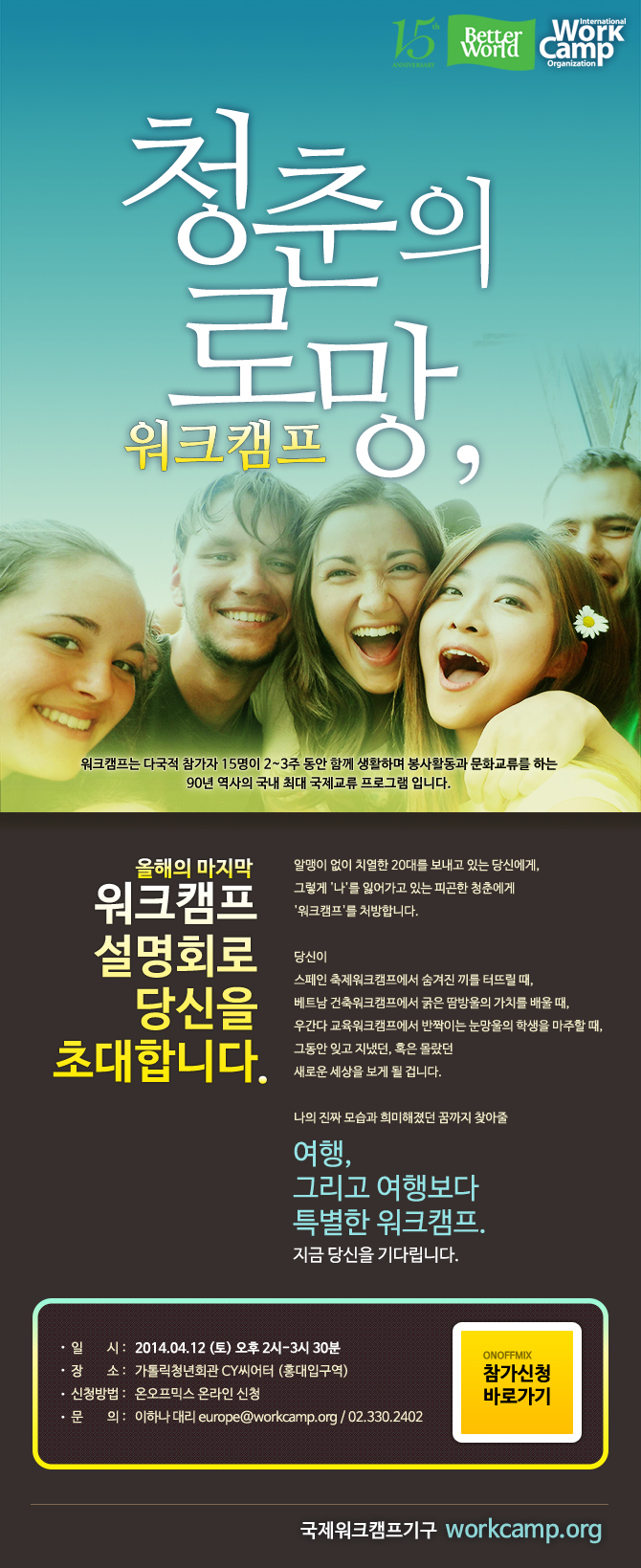 모집 올해의 마지막 워크캠프 설명회! 놓치지 마세요. 2014-04-02 작성자: 관리자 조회수: 2,140 국제워크캠프기구 < 이전 [발표] 2014 한국워크캠프리더 서류전형 합격자 다음 > [발표] 2014 한국워크캠프리더 최종 합격자 목록