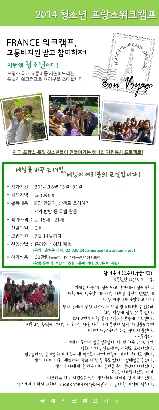 모집 프랑스 청소년 워크캠프, 교통비 지원 받고 참여하자! 2014-07-01 작성자: 관리자 조회수: 1,607 < 이전 [모집] 아직 늦지 않았다. 하반기 워크캠프 설명회! 다음 > [발표] 2014 하반기 가을/겨울 워크캠프 목록