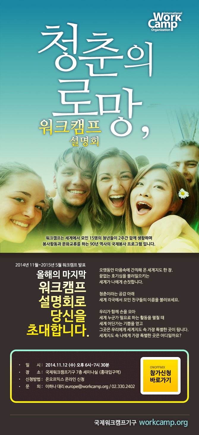 모집 청춘의 로망, 워크캠프 설명회 2014-10-31 작성자: 관리자 조회수: 1,483 국제워크캠프기구 < 이전 [마감] LOVE India, 인도장기자원봉사 3기 모집 다음 > [안내] 아시아 워크캠프에 전 세계 청년들이 참가하는 이유! 목록