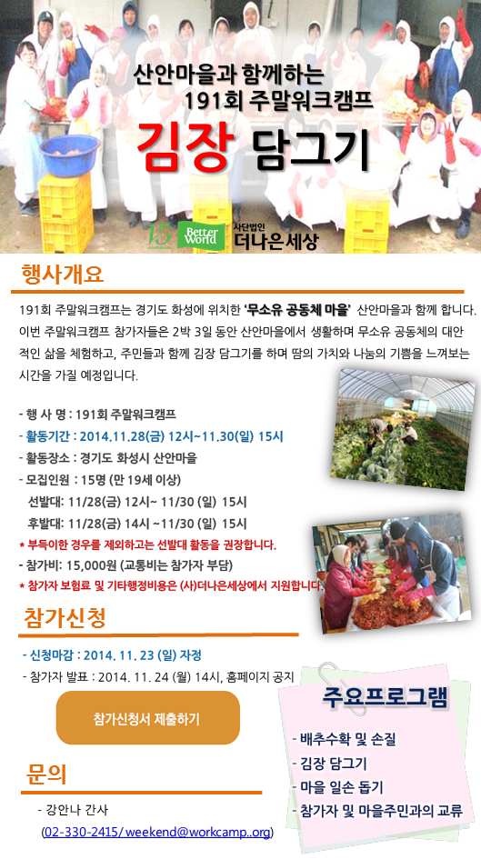 마감 191회 화성산안마을 주말워크캠프 11월 28일(금)-30일(일) 2014-11-10 작성자: 관리자 조회수: 1,099 < 이전 [안내] 아시아 워크캠프에 전 세계 청년들이 참가하는 이유! 다음 > [발표] LOVE India 3기 최종합격자 발표 목록