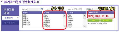 워크캠프 검색 > 통합 검색 > Keyword > 캠프 코드 입력을 통해 확인할 수 있습니다.