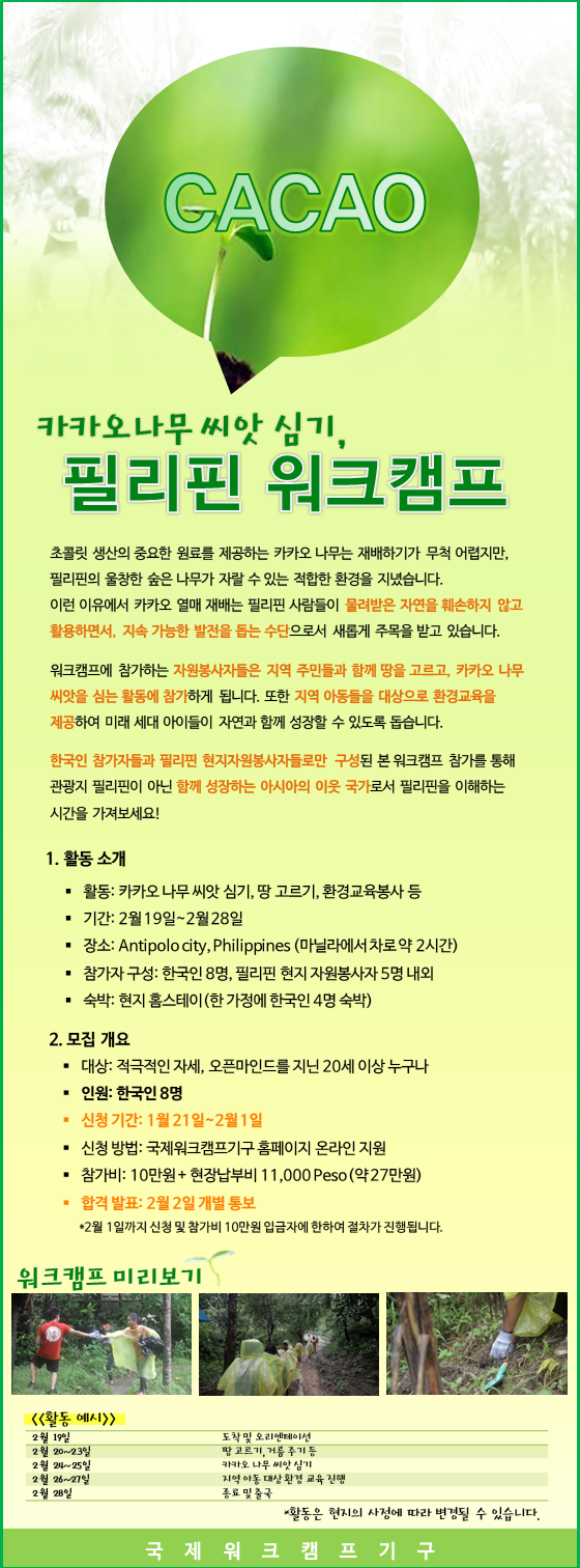 모집 한국과 필리핀, 워크캠프에서 카카오로 톡(TALK) 하다! 2015-01-21 작성자: 관리자 조회수: 1,210 *이미지를 클릭하면 프로그램의 보다 자세한 내용을 확인할 수 있습니다. *이미지를 클릭하면 프로그램의 보다 자세한 내용을 확인할 수 있습니다. < 이전 [마감] 워크캠프 사업지원 인턴 다음 > [발표] 워크캠프 사업지원 인턴채용 서류전형 합격자 목록