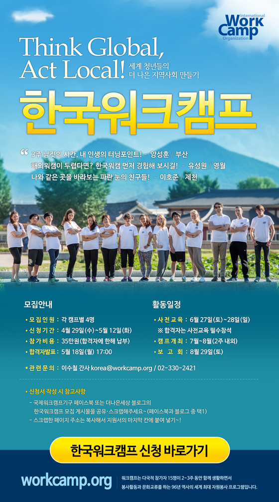 모집 2015 한국워크캠프 참가자 모집 2015-04-29 작성자: 관리자 조회수: 4,548 한국워크캠프 참가 신청 바로가기 < 이전 [발표] 2015 UNESCO 세계유산자원봉사단 8기 합격자 안내 다음 > [마감] 192회 부산꽃마을 주말워크캠프 5.16(토)~17(일) 목록