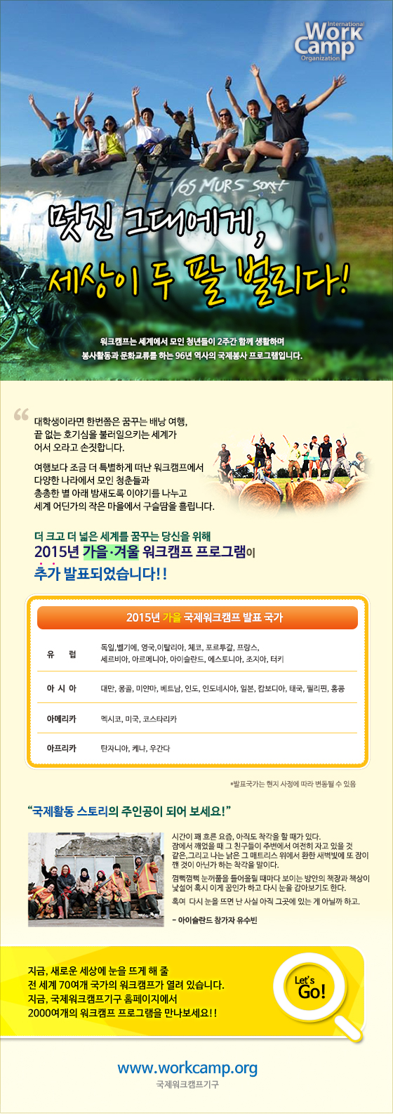 발표 2015 가을, 겨울 워크캠프 2015-07-20 작성자: 관리자 조회수: 4,120 < 이전 [모집] 독일, 토론워크캠프 다음 > [공지] 1년 이상 로그인 하지 않은 회원 휴면계정 처리 안내 목록