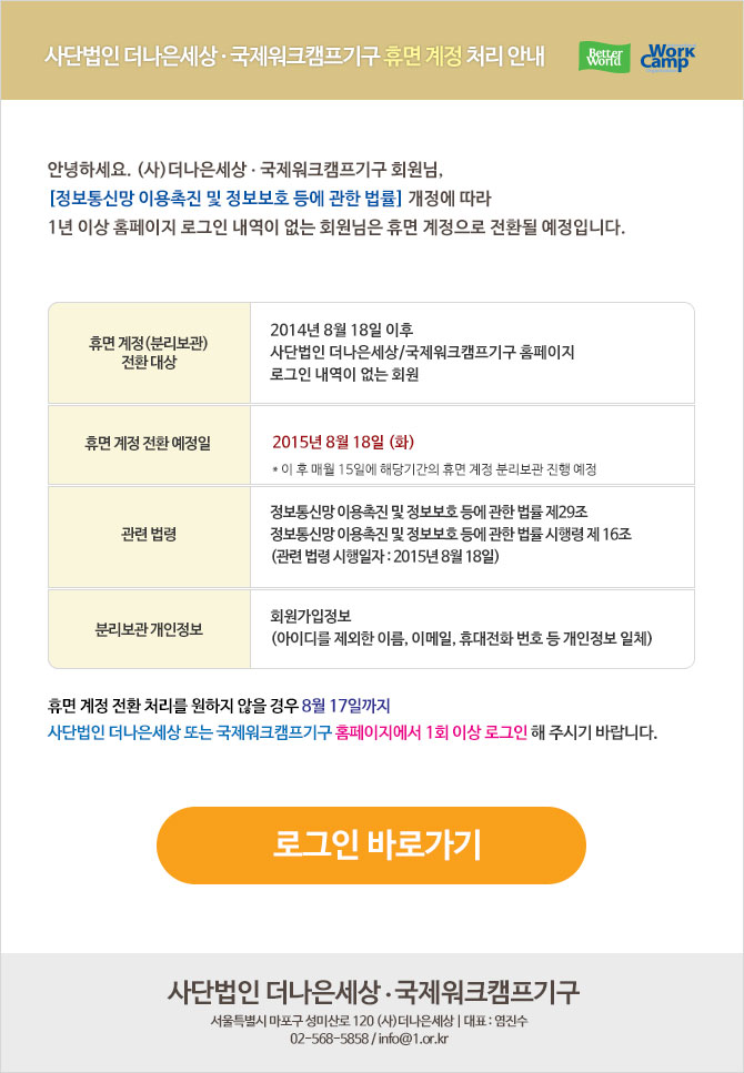 공지 1년 이상 로그인 하지 않은 회원 휴면계정 처리 안내 2015-08-03 작성자: 관리자 조회수: 979 < 이전 [발표] 2015 가을, 겨울 워크캠프 다음 > [소식] 천국의 알바 12기_프랑스 워크캠프 활동 종료 목록