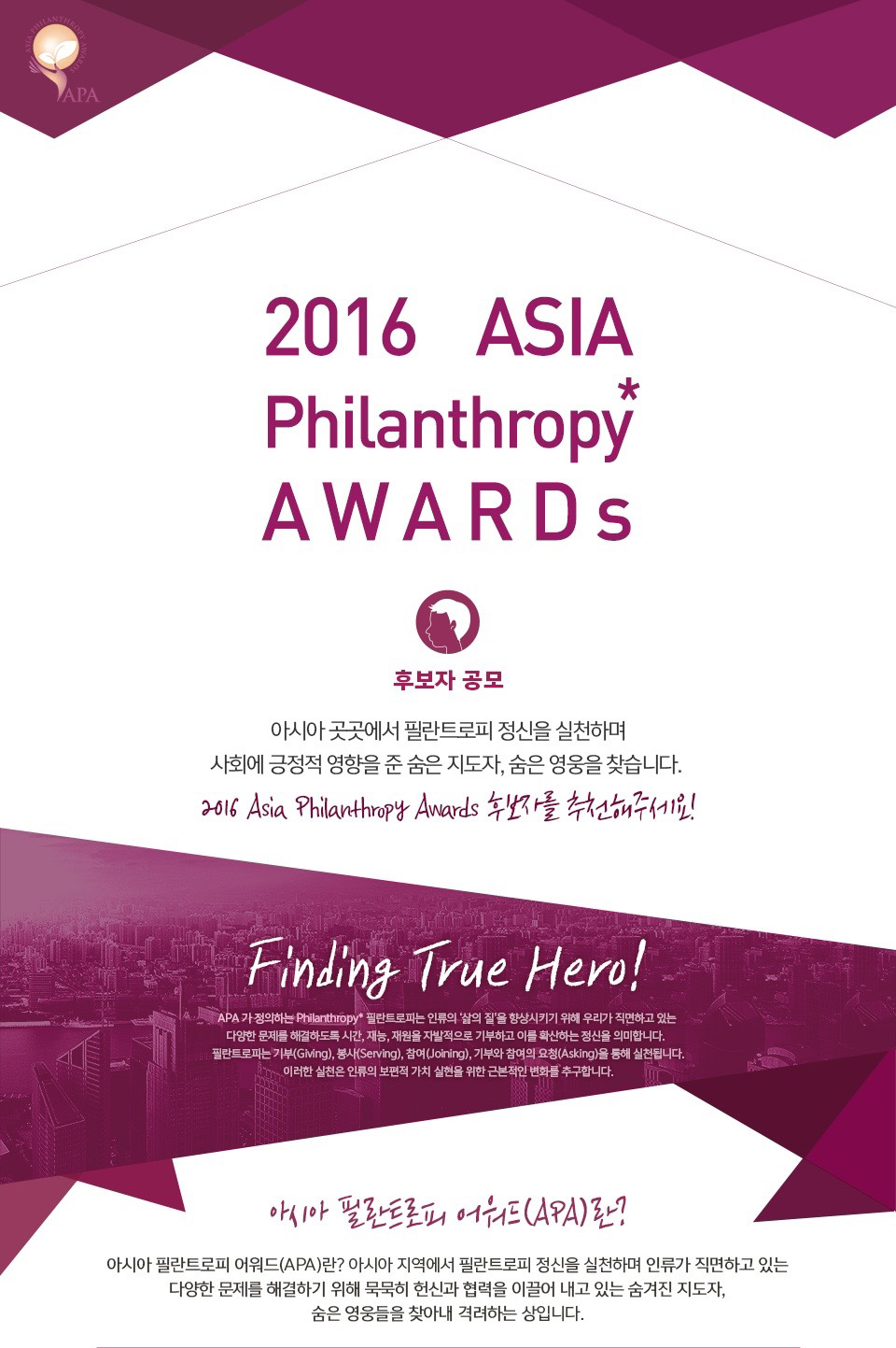 안내 청소년 필란트로피스트를 찾습니다. 2016-02-12 작성자: 관리자 조회수: 846 ASIA Philanthropy Awards 후보자 공모 청소년 필란트로피스트를 찾습니다 자세한 내용을 보시려면 위 이미지를 클릭하세요. < 이전 [마감] 국제 자원봉사 사업 담당 다음 > [안내] 미국 VFP 추가 제출서류 양식 목록
