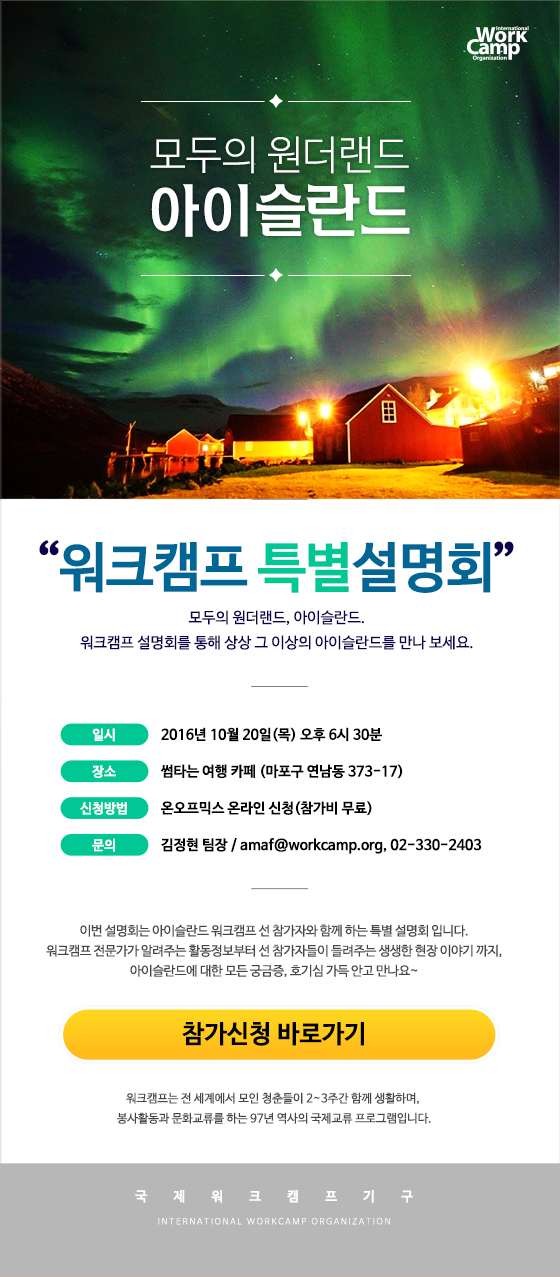 모집 아이슬란드 특별 설명회(10/20) 2016-09-26 작성자: 관리자 조회수: 1,378 < 이전 [마감] 영월 주말워크캠프, 이번에는 반드시 마무리하리라! 다음 > [안내] 11-12월 워크캠프 리스트 목록