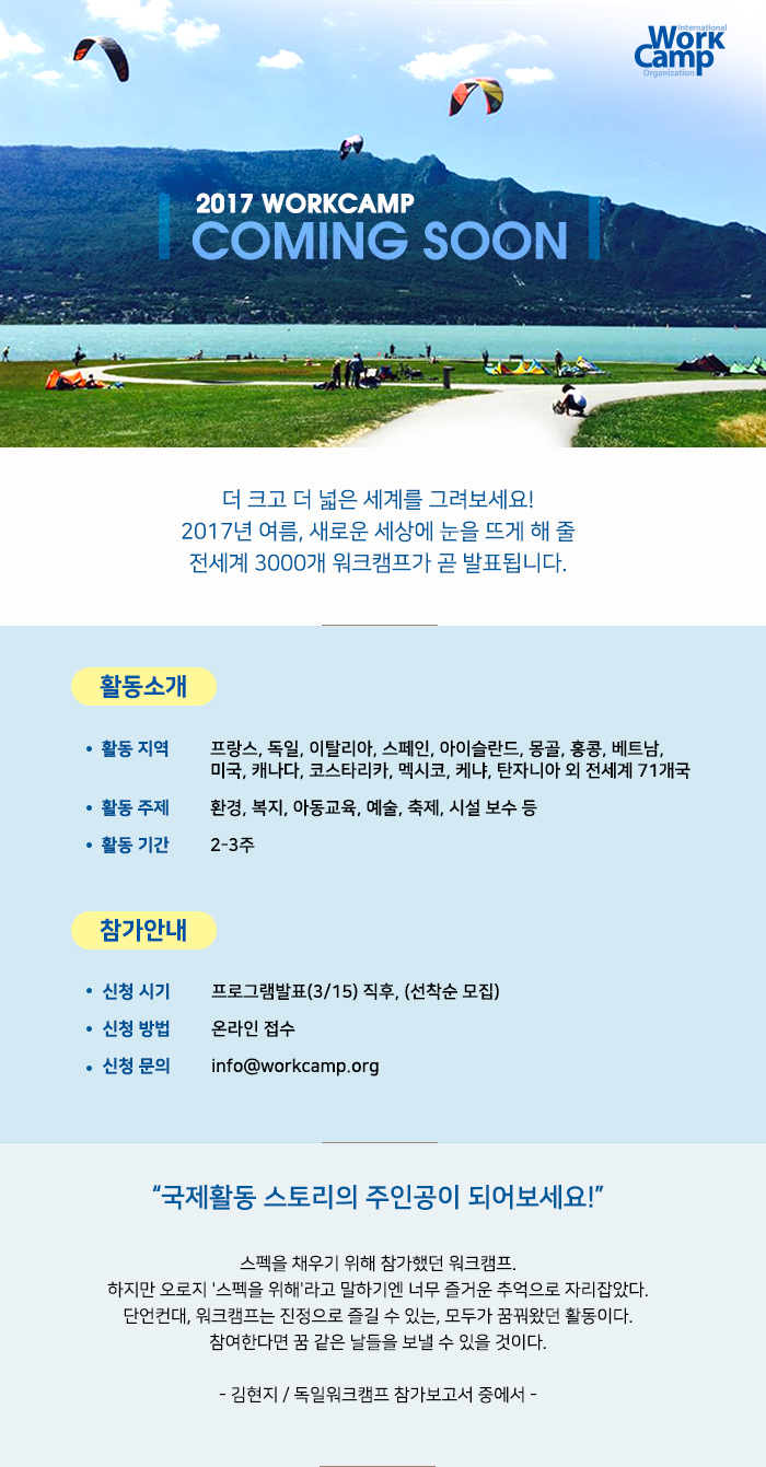 2017 여름 워크캠프 coming soon! 2017-03-07 작성자: 관리자 조회수: 1,440 < 이전 [마감] 스페인 남부, 다이빙 워크캠프 개최! 다음 > ​[발표] 워크캠프 서포터즈 최종 선발자 목록
