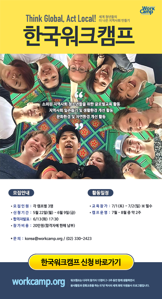 마감 2017 한국워크캠프 참가자 2017-05-22 작성자: 관리자 조회수: 3,469 한국워크캠프 참가 신청 바로가기 < 이전 [마감] Saturday Volunteers! 성미산마을(서울 마포) 다음 > [마감] 폴란드에서 아이들과 함께해요! 목록