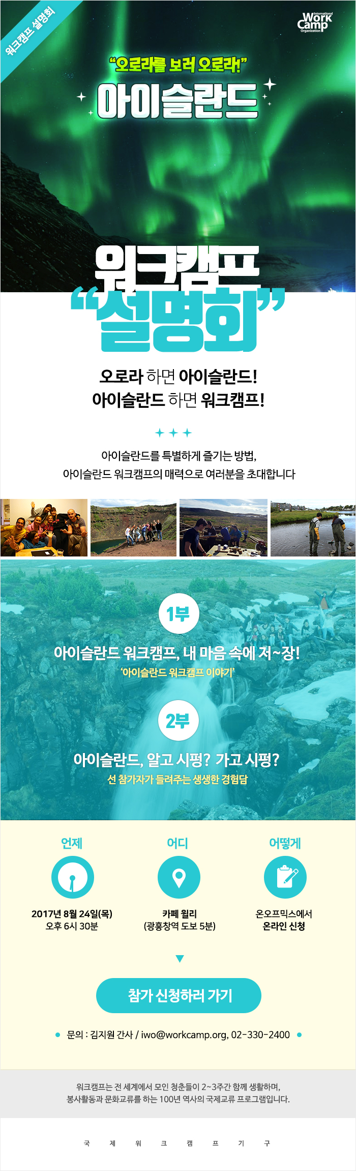 마감 아이슬란드 워크캠프 설명회 2017-07-28 작성자: 관리자 조회수: 1,609 < 이전 [마감] LOVE Korea 9월 프로그램 한국인 봉사자 모집 다음 > [안내] 하반기 워크캠프 목록
