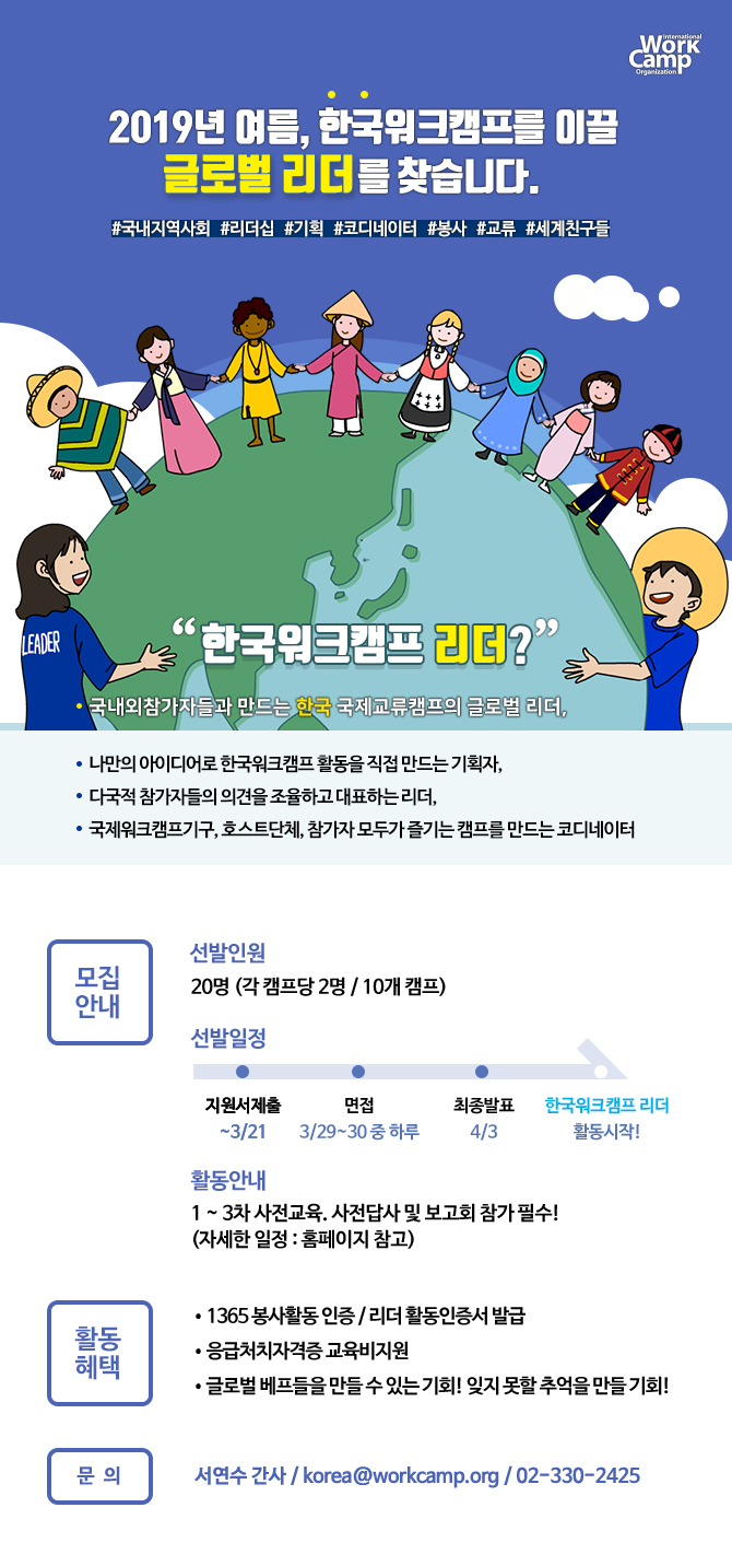 마감 2019년 한국워크캠프의 글로벌 리더를 찾습니다! 2019-02-18 작성자: 관리자 조회수: 616 < 이전 [공지] 워크캠프 합격자 리스트(2월) 다음 > [모집] 향긋한 커피와 함께하는 워크캠프 설명회, 워캠토크 2차 오픈! 목록