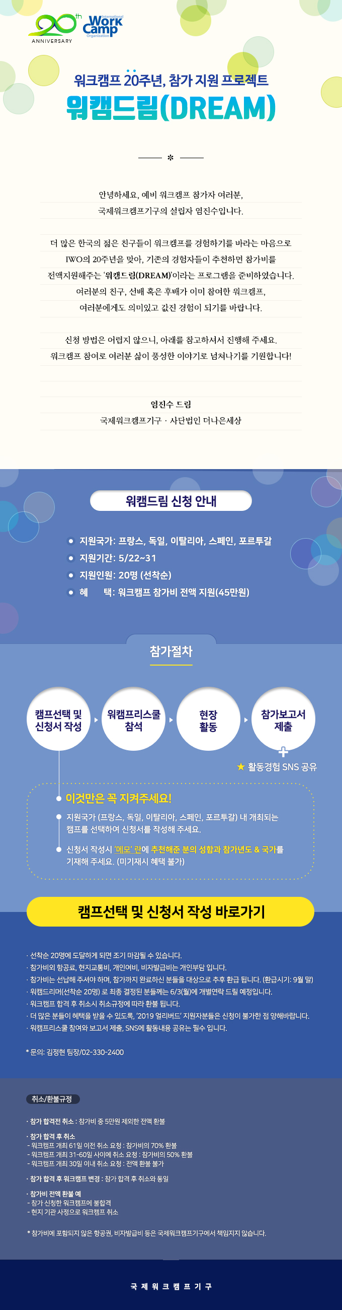 모집 워크캠프 20주년 그리고 워캠드림(DREAM) 2019-05-21 작성자: 관리자 조회수: 709 < 이전 [마감] 2019년 한국워크캠프 참가자를 모집합니다. 다음 > 2019년 한국워크캠프 리더 2차교육 (5/18-19) 목록