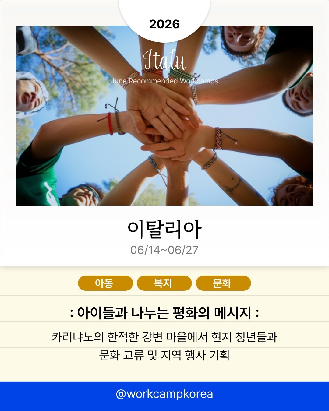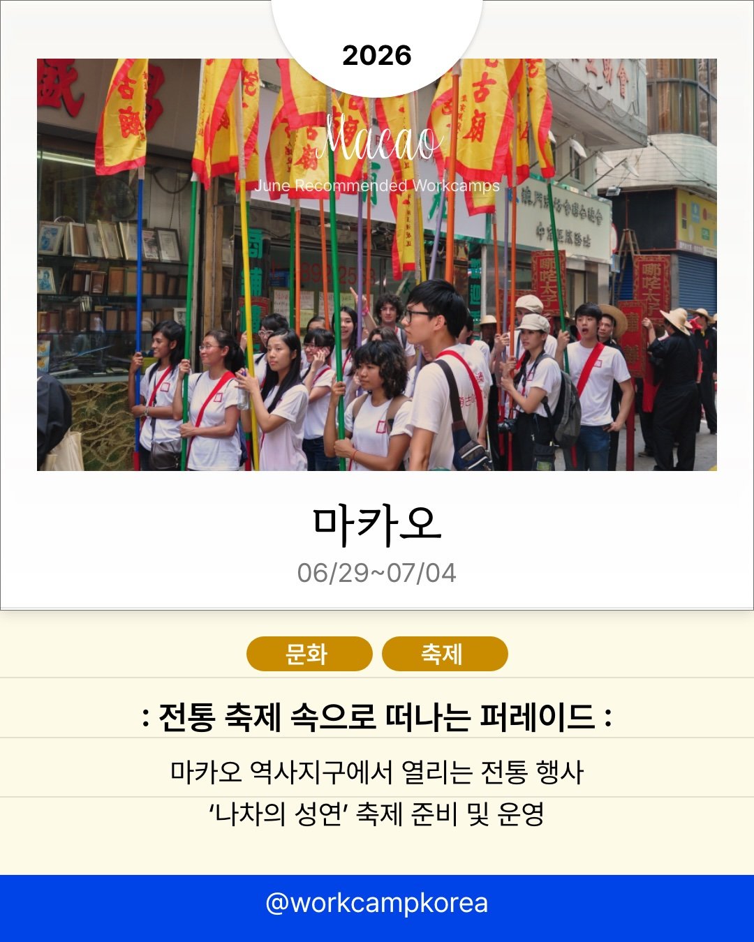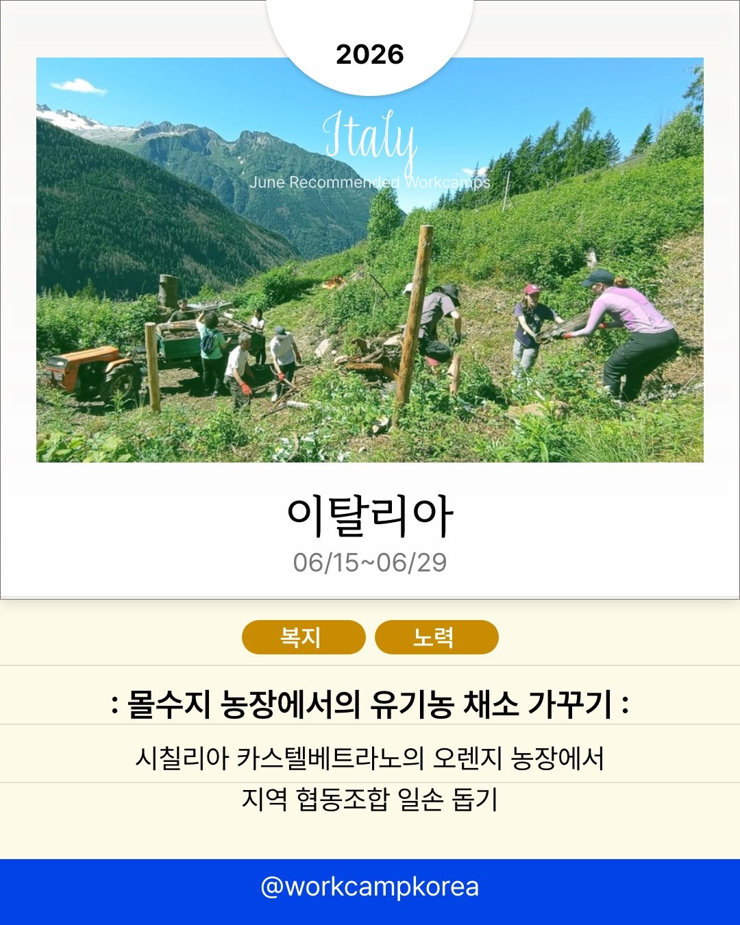 전 세계 각지에서 열리는 워크캠프 소식을 전해드려요. 시칠리아의 오렌지 농장부터 아이슬란드의 스키장, 마카오의 전통 축제 현장까지. 관광객이 아닌 현지인의 시선으로 2주간 머물며 각 지역의 일상을 직접 경험해 보세요. 프로그램별 모집 인원이 5명에서 20명 사이로 적어 조기 마감될 수 있으니, 관심 있는 국가는 지금 바로 세부 일정을 확인해 보세요!