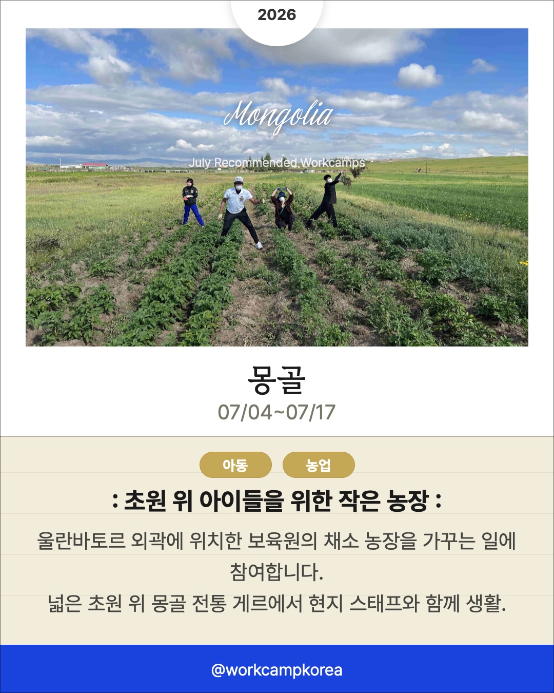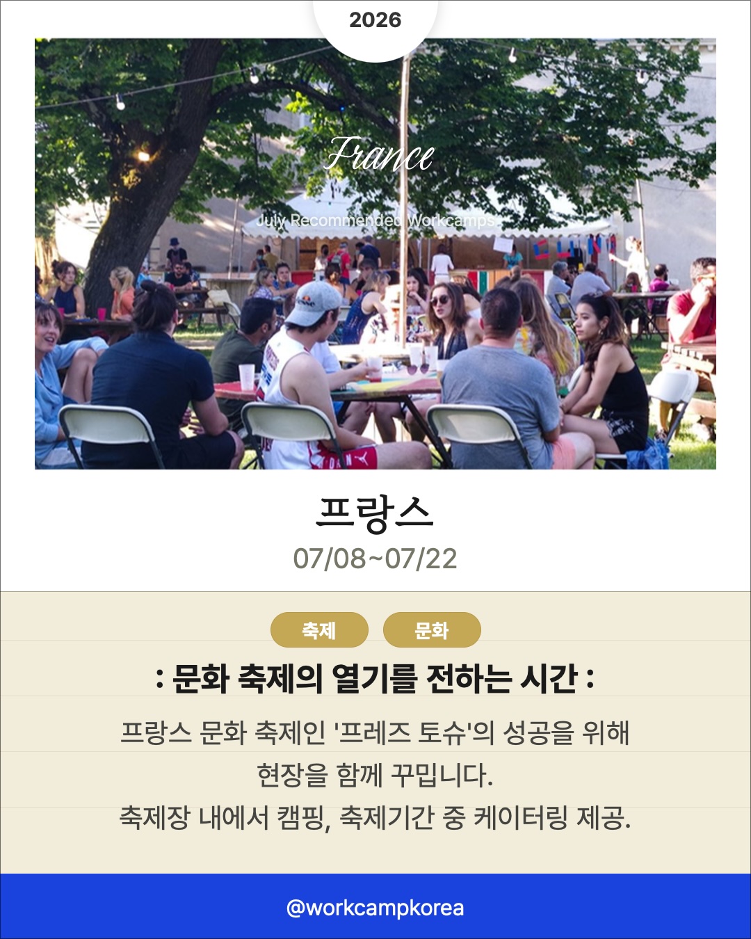 7월에 떠나기 좋은 해외 워크캠프 리스트를 준비했어요. 프랑스 문화 축제의 열기부터 알프스 고산지대의 대피소, 몽골 초원 위 게르까지! 각국의 청년들과 함께 머물며 현지의 일상을 깊숙하게 경험해 볼 수 있답니다.