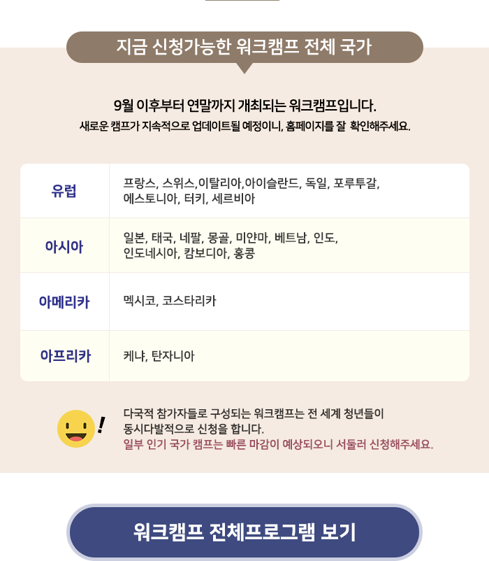 워크캠프로 가을여행 어떠세요? [08.16] 2018-09-03 작성자: 관리자 조회수: 113 < 이전 이 (더위) 또한 지나가리라 [7.27] 다음 > 봄엔 유럽 소도시 [02.01] 목록